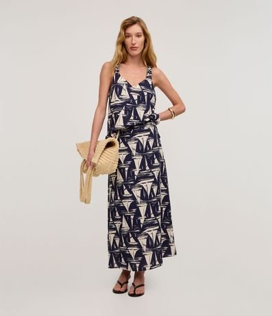 Ref: Regata feminina confeccionada em viscose certificada mais sustentável. Possui modelo reto e solto, decote em v, alças largas com detalhes torcidos e estampa de veleiros e traços que remetem ao mar.