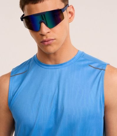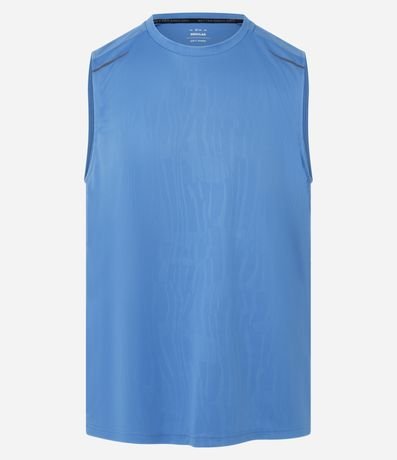 Ref: Regata masculina, esportiva, modelo regular, com gola redonda. Peça contém estampa heat print, recortes e detalhe de linhas.