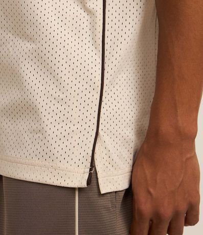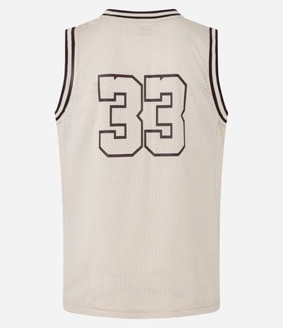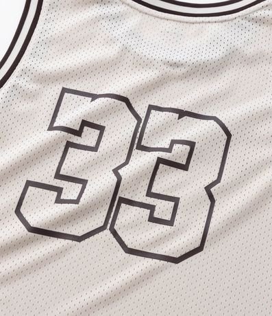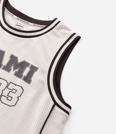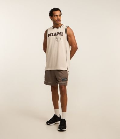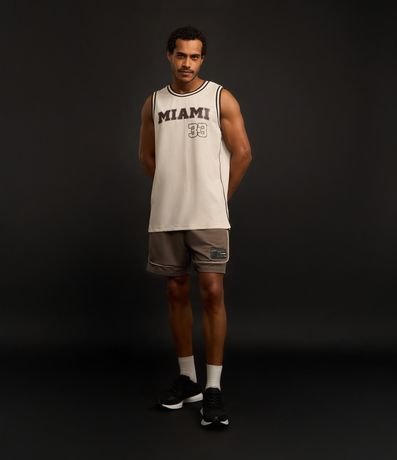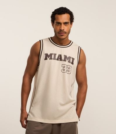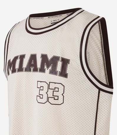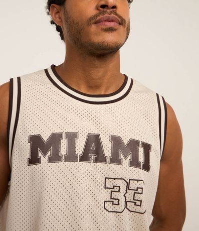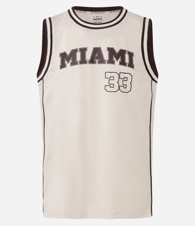 Ref: Regata esportiva masculina confeccionada com tecnologia dry, no modelo de basquete. Possui gola redonda, viés contrastante estampa lettering "Miami 33".