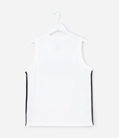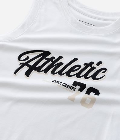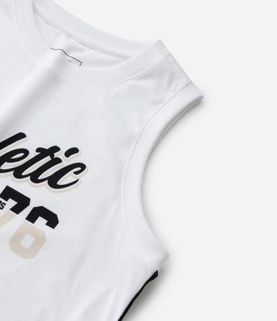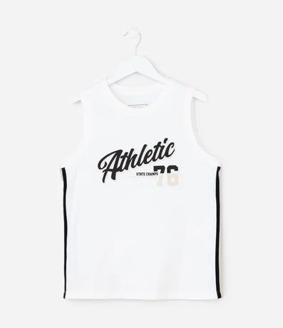 Ref: Regata infantil esportiva de gola redonda, com recortes laterais contrastantes e lettering "Athletic 76". Peça feita a partir de material e processo mais sustentável.