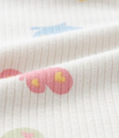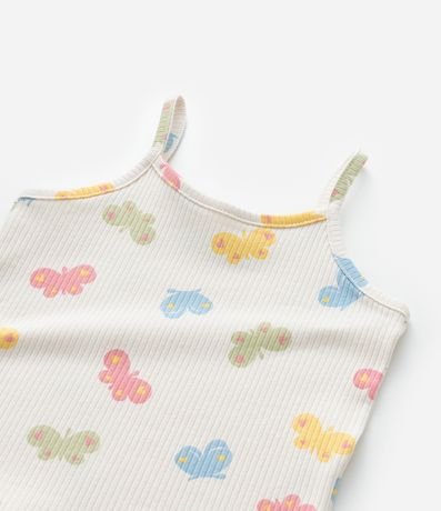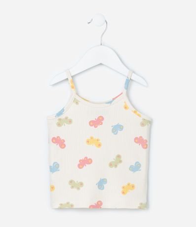 Ref: Regatinha infantil canelada, com alças finas e estampa de borboletinhas. O item é confeccionado com boas práticas ambientais e algodão certificado bci.