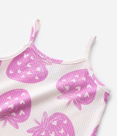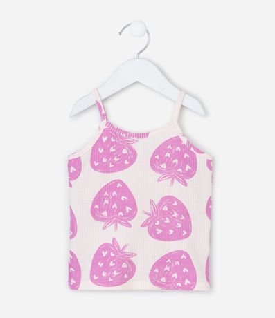 Ref: Blusinha infantil confeccionada em malha ribana de algodão, com golinha redonda e alças finas. Possui textura caneladinha e estampa de morangos.
