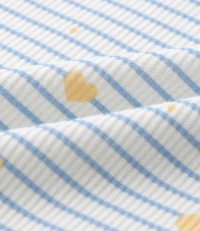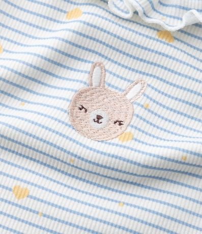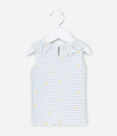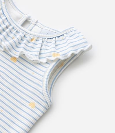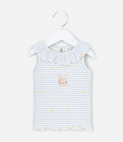 Ref: Regata infantil com gola redonda e babadinho, com estampa de bichinho, fundo listrado e frufru na barra. A peça é confeccionada com boas práticas ambientais e algodão certificado bci.