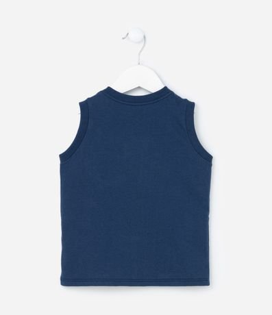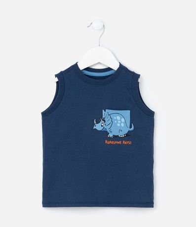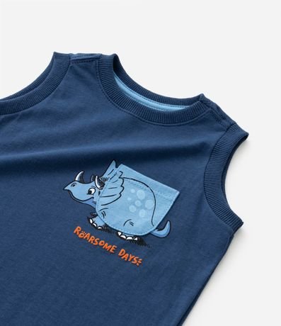 Regatinha infantil confeccionada em algodão com gola redonda, sem mangas e com bolsinho com estampa de dinossauro.