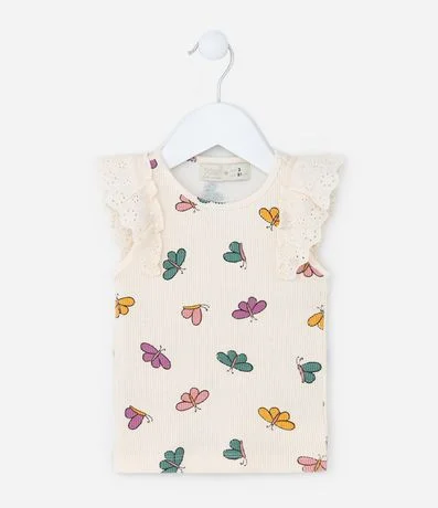 Regata infantil confeccionada em ribana de algodão mais sustentável. A blusa tem gola redonda, broderie nos ombros e estampa total de borboletas.