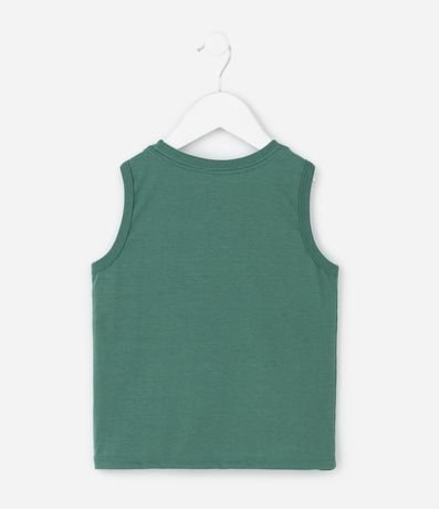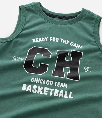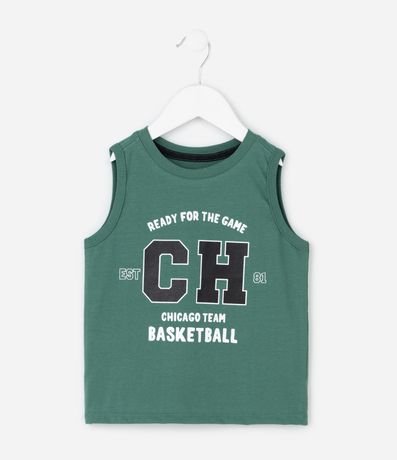 Ref: Regata infantil confeccionada em meia malha, com gola redonda e acabamento canelado nas cavas. Possui estampa localizada em estilo college na parte frontal e estrutura reforçada nas extremidades.