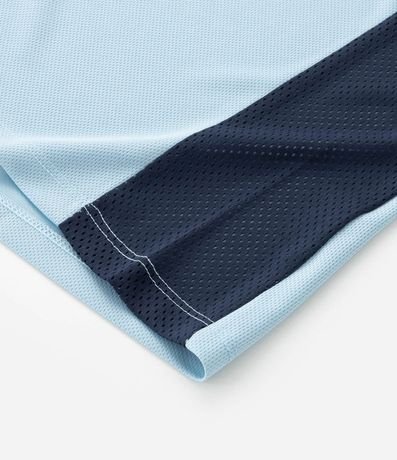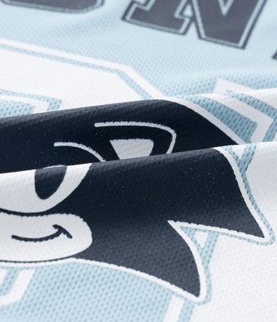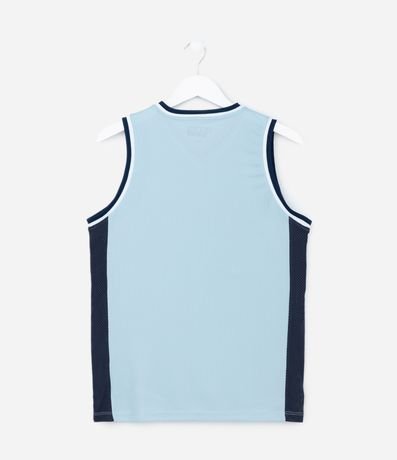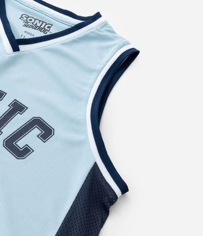 Ref: Regata infantil com tema de basquete, decote V, recortes laterais contrastante e estampa frontal do Sonic.