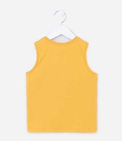 Camiseta regata infantil com gola redonda e estampa do Simba, do Rei Leão. A peça é confeccionada com boas práticas ambientais e algodão certificado bci.