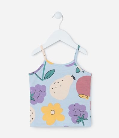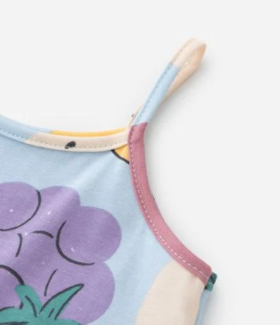 Ref: Regata infantil confeccionada em material mais sustentável, com alças finas e estampa divertida de frutinhas e florzinhas.