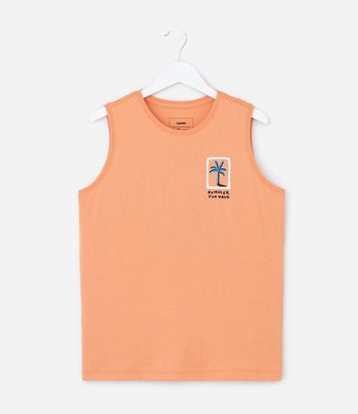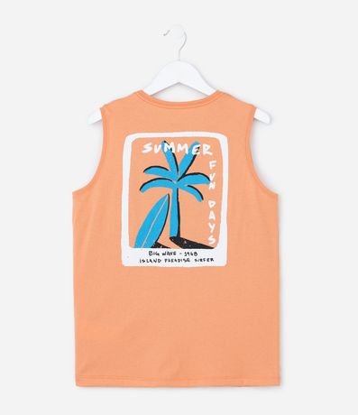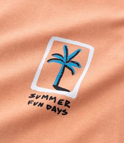 Ref: Regata infantil confeccionada em algodão de material mais sustentável, com gola redonda e estampa frente e costas de coqueiro e prancha.