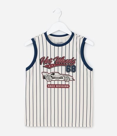 Ref: Regata infantil confeccionada com tecnologia dry através de boas práticas ambientais. Possui gola redonda, viés contrastante, estampa de listras e lettering "Hot Wheels".
