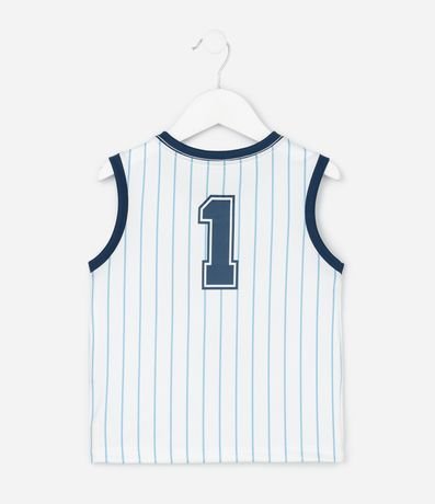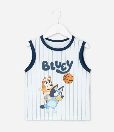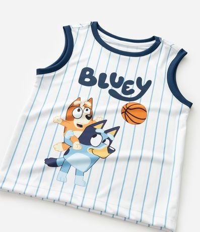 Ref: Regata infantil de basquete confeccionada em microfibra através de boas práticas ambientais. Possui gola redonda, estampa de listras, viés contrastante e estampa Bluey e Bingo jogando basquete.