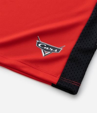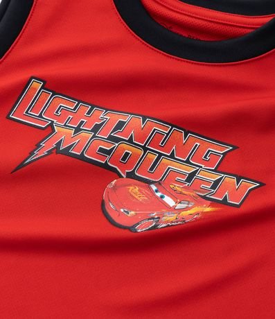 Regata infantil de basquete confeccionada em microfibra através de boas práticas ambientais. Possui gola redonda, listras largas laterais e estampa Relâmpago McQueen de Carros.