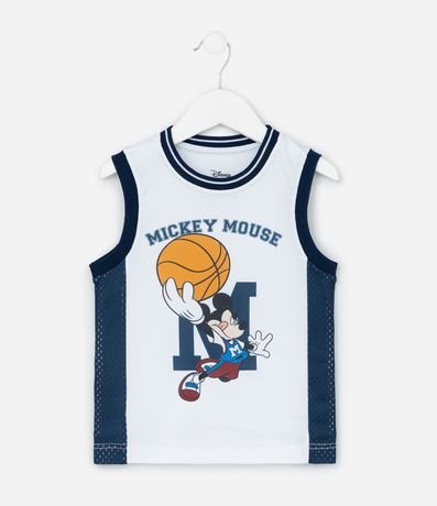 Ref: Regata infantil confeccionada em microfibra, no modelo de basquete. Possui gola redonda, com detalhe contrastante, estampa e lettering Mickey Mouse.