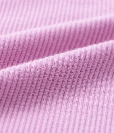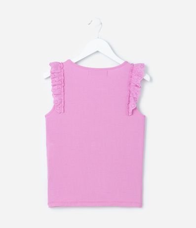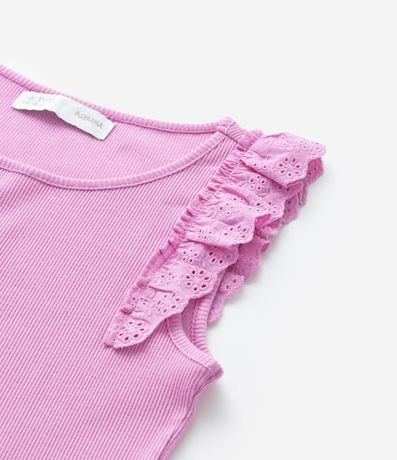 Blusa infantil de modelo regata, confeccionada em malha ribana de algodão, com textura canelada e sem estampa. Possui gola redonda e babadinhos nos ombros com broderie.