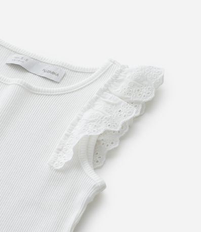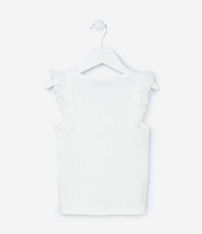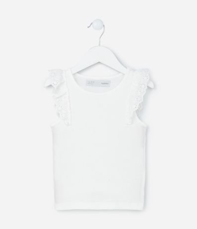 Ref: Blusa infantil de modelo regata, confeccionada em malha ribana de algodão, com textura canelada e sem estampa. Possui gola redonda e babadinhos nos ombros com broderie.