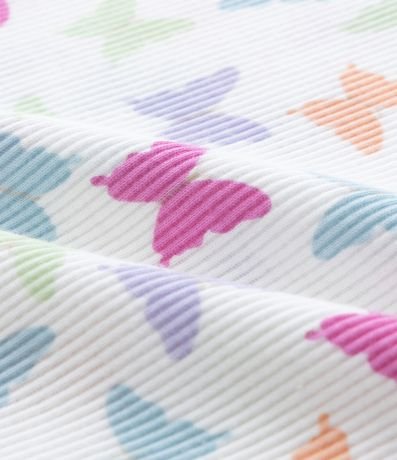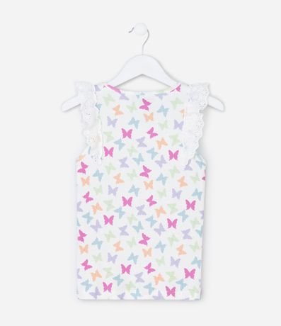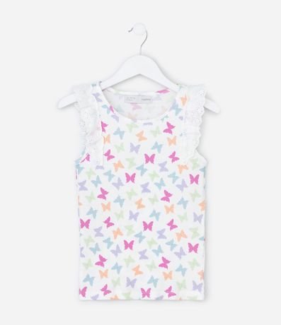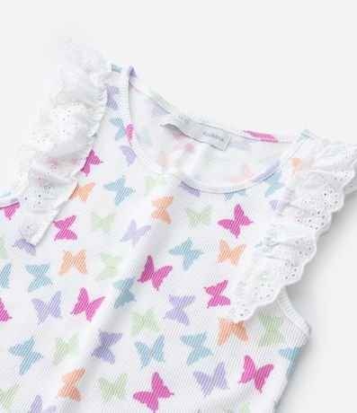 Ref: Regatinha infantil confeccionada em ribana de material mais sustentável. Possui gola redonda, babadinho em broderie nas cavas e estampa de borboletas.