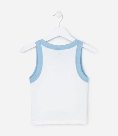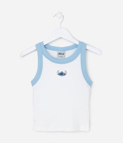 Regatinha infantil confeccionada em ribana caneladinha, de material mais sustentável. Possui gola e cavas contrastantes e bordado do Stitch no peito.