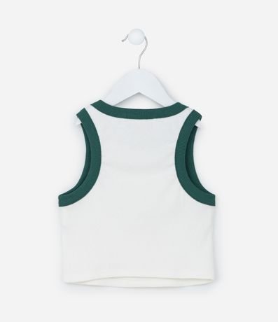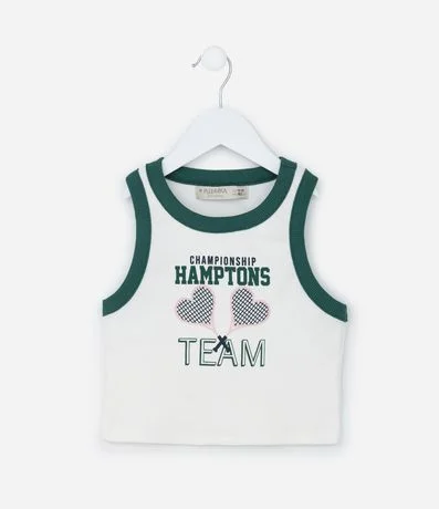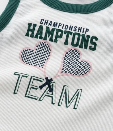 Ref: Regata infantil confeccionada em ribana, com estilos esportivo, gola e cavas contrastantes, estampa de raquetes de tênis e lettering "Championship Hamptons Team". A peça é confeccionada com boas práticas ambientais e algodão certificado bci.