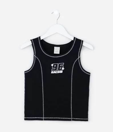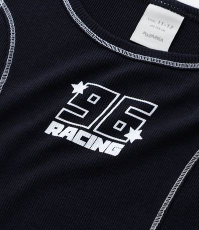 Ref: Regata infantil com gola redonda, e estampa lettering "96 Racing". O item é confeccionado com ribana e boas práticas ambientais e algodão certificado bci.