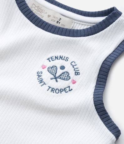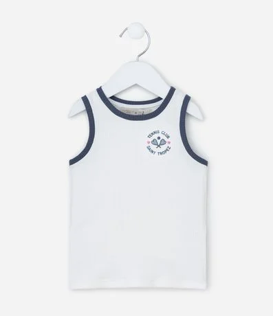 Regata infantil confeccionada em ribana de material e processo mais sustentável. Possui gola redonda, bordado no peito de raquetes e lettering "Tennis Club Saint Tropez"