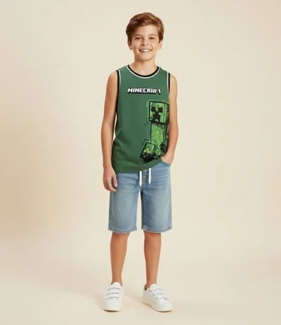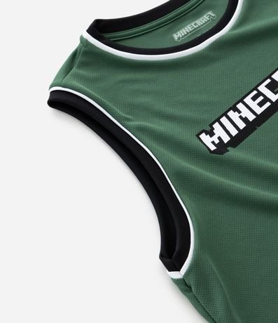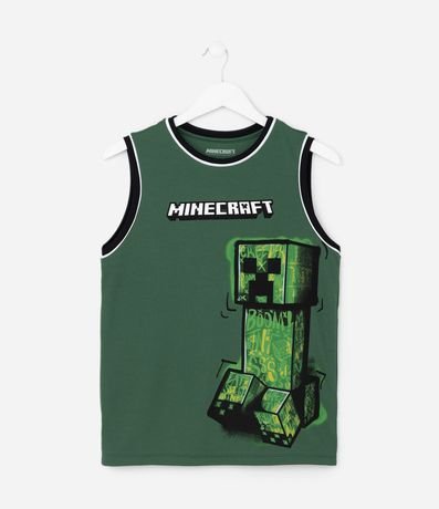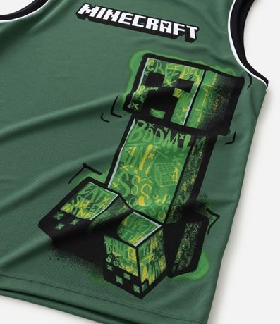 Regata infantil confeccionada em microfibra com tecnologia Dry, que auxilia na evaporação do suor. Possui gola redonda e acabamento contrastante nas cavas, além de estampa localizada do Creeper, personagem icônico do universo Minecraft, aplicada na parte frontal.