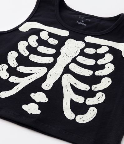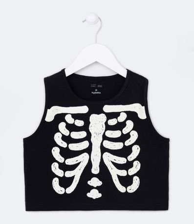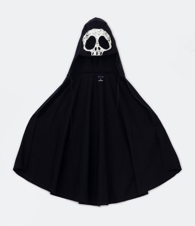 Regata infantil, em meia malha com estampa frontal de esqueleto. Acompanha capa com capuz estampado de caveira que brilha no escuro.