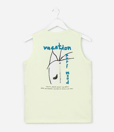 Ref: Regata infantil confeccionada em algodão mais sustentável através de boas práticas ambientais. Possui gola redonda, estampa de praia a e lettering "Vacation Surf Mood".