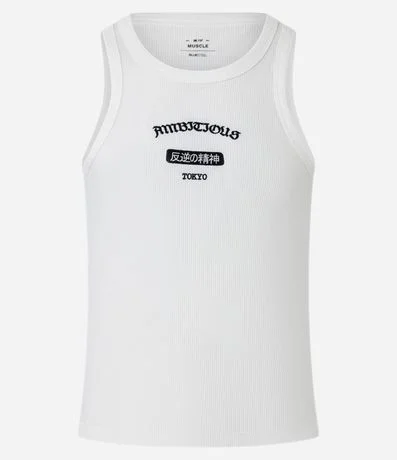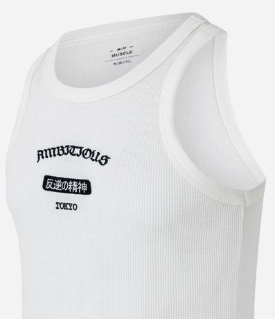 Ref: Regata masculina confeccionada em algodão mais sustentável, com gola redonda, no modelo muscle peça contém estampa bordada lettering.