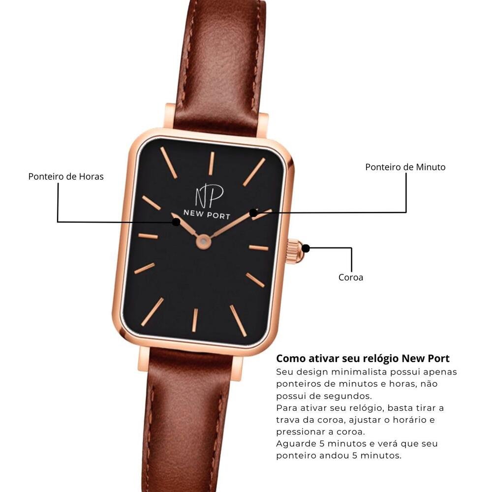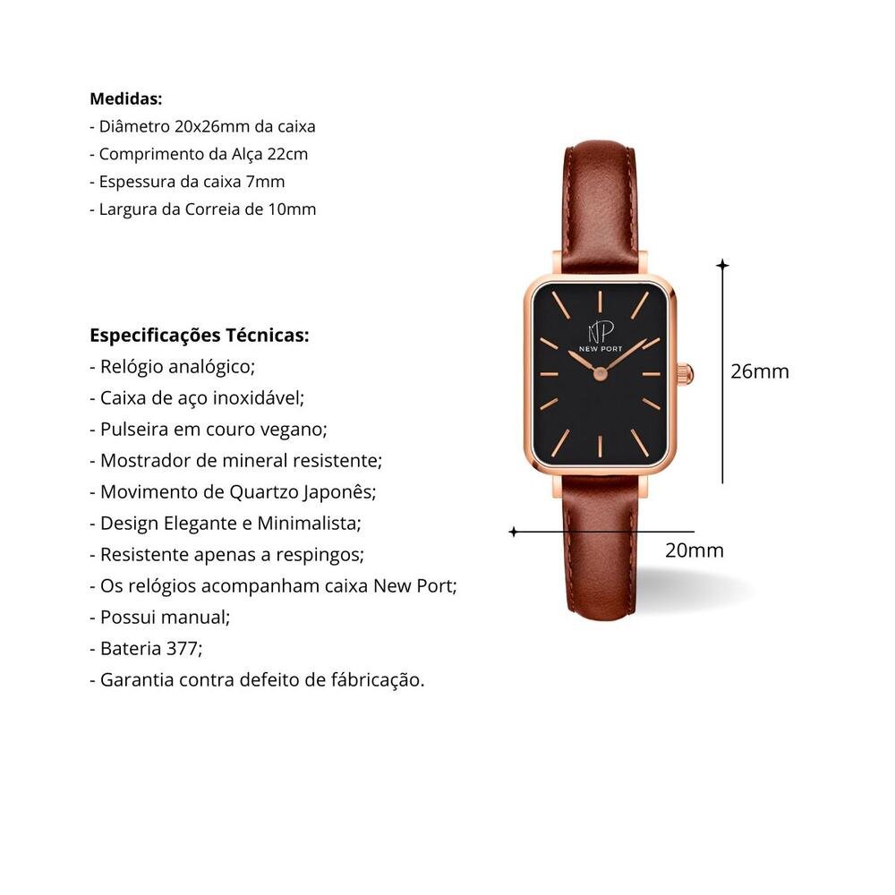 O Kit apresenta o Relógio Feminino New Port Quadrado Piermont Fundo Preto, com sua pulseira de couro vegano marrom, possui um elegante diâmetro de 20x26mm. Sua caixa em metal rosê abriga um mostrador preto, protegido por vidro de mineral resistente, garantindo durabilidade e estilo. Complementando-o, o clássico bracelete rosé em aço inoxidável foi meticulosamente desenhado para espelhar a cativante beleza dos nossos relógios casuais minimalistas.