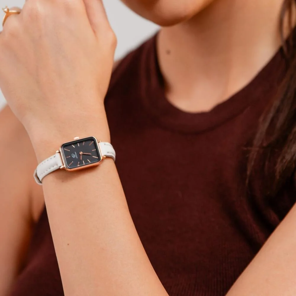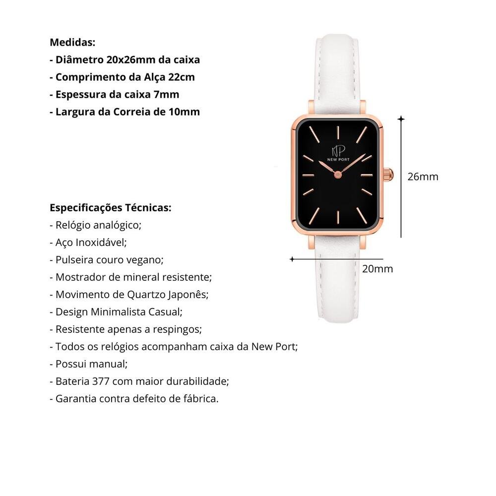 Ref: O Relógio Feminino New Port Quadrado Casual Piermont Rosé, com sua pulseira de couro vegano branca, possui um elegante diâmetro de 20x26mm. Sua caixa em metal rosé abriga um mostrador preto, protegido por vidro de mineral resistente, garantindo durabilidade e estilo.