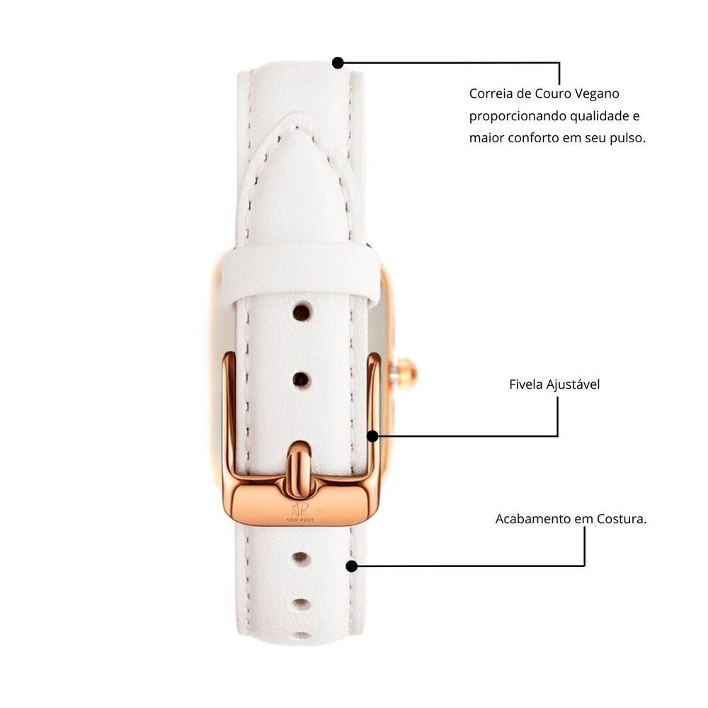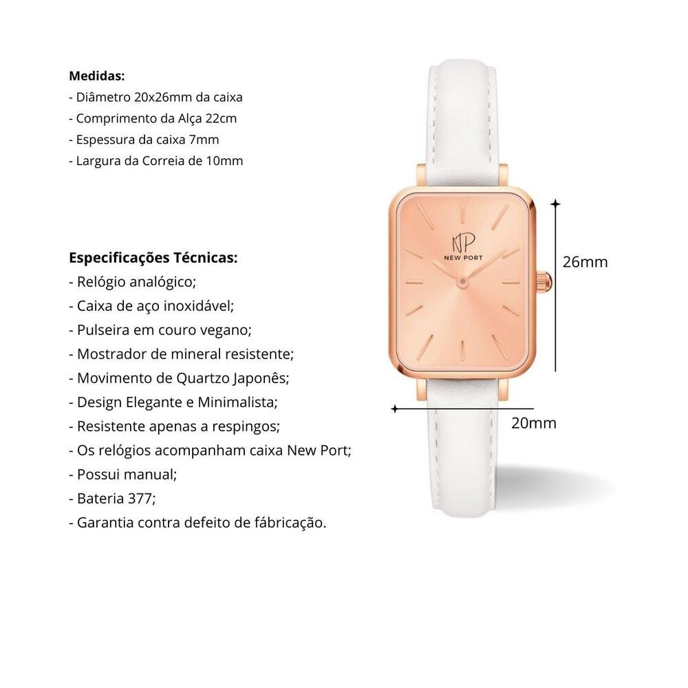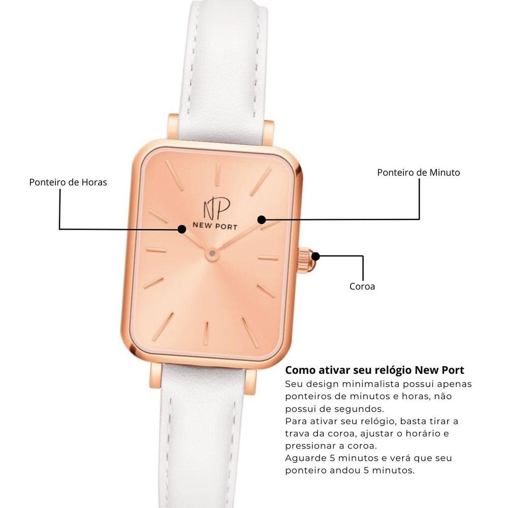 Ref: O Kit apresenta o Relógio Feminino New Port Quadrado Piermont Branco, uma peça de design impecável que se destaca pelo vidro mineral de alta resistência, garantindo durabilidade e elegância. Seu bracelete rosé gold em aço inoxidável, clássico e refinado, foi cuidadosamente projetado para complementar a beleza minimalista e atemporal dos nossos relógios casuais.