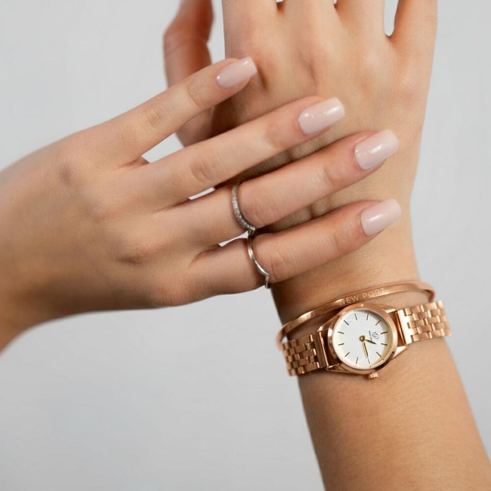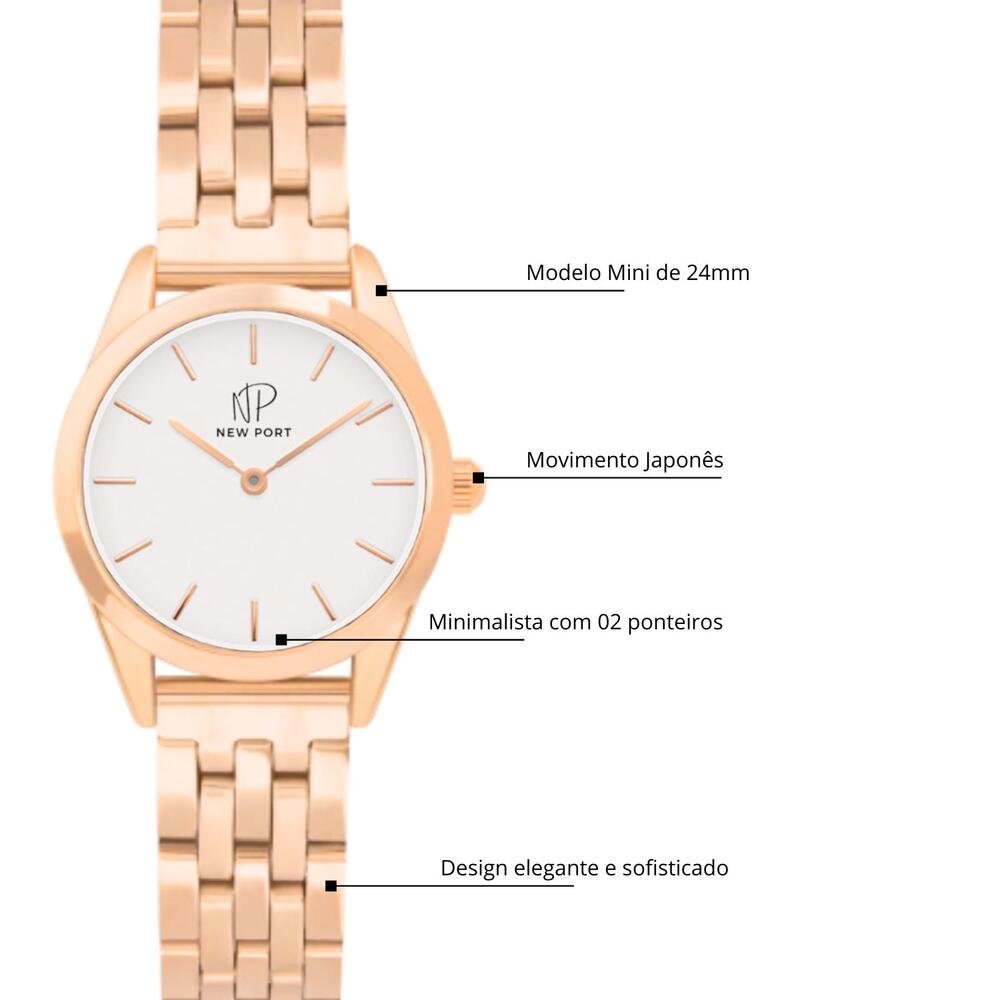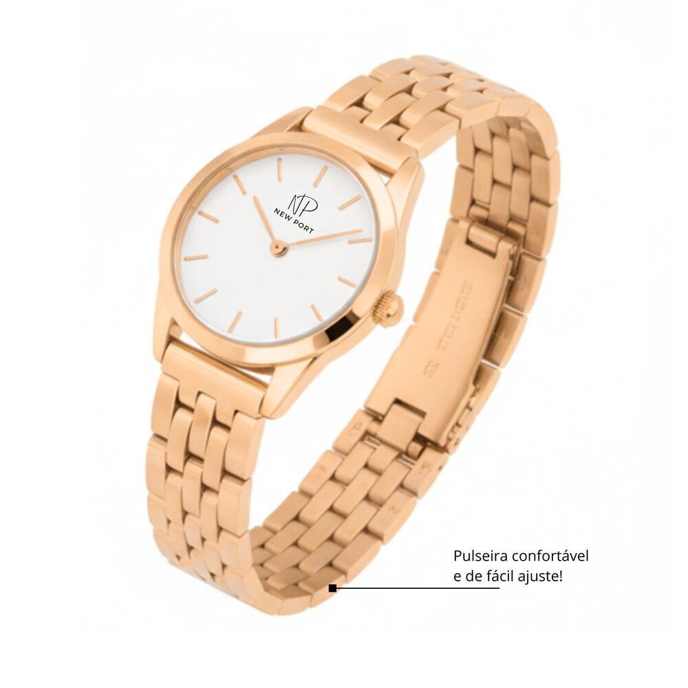 Sua caixa de 24 mm com fundo branco traz leveza ao visual, enquanto a pulseira de elos gold rose adiciona um toque de brilho e sofisticação. Pequeno no tamanho, mas gigante na presença.