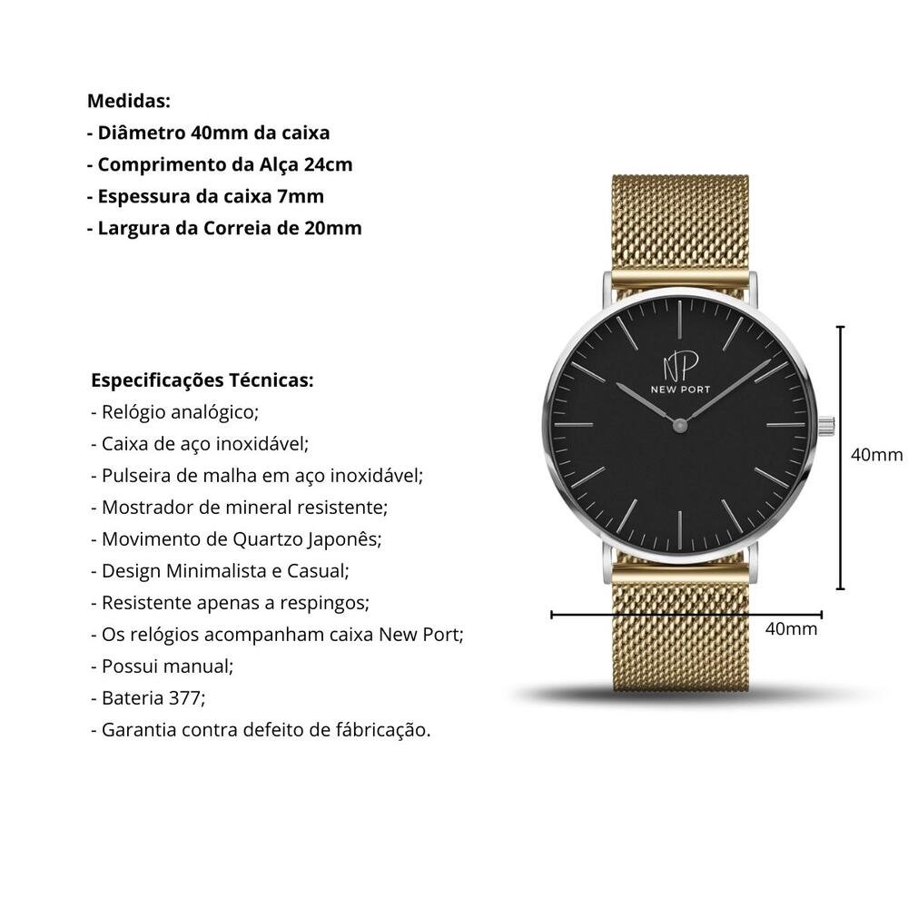 Ref: O Relógio Masculino de Pulso Bonaparte Casual Dourado, com sua pulseira em metal dourada, apresenta um generoso diâmetro de 40mm. A caixa é construída em metal prateado, abrigando um mostrador preto protegido por um vidro de mineral com alta resistência.
