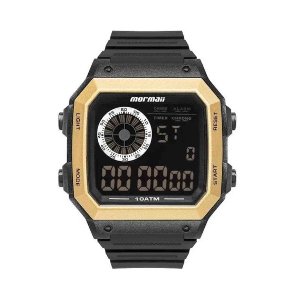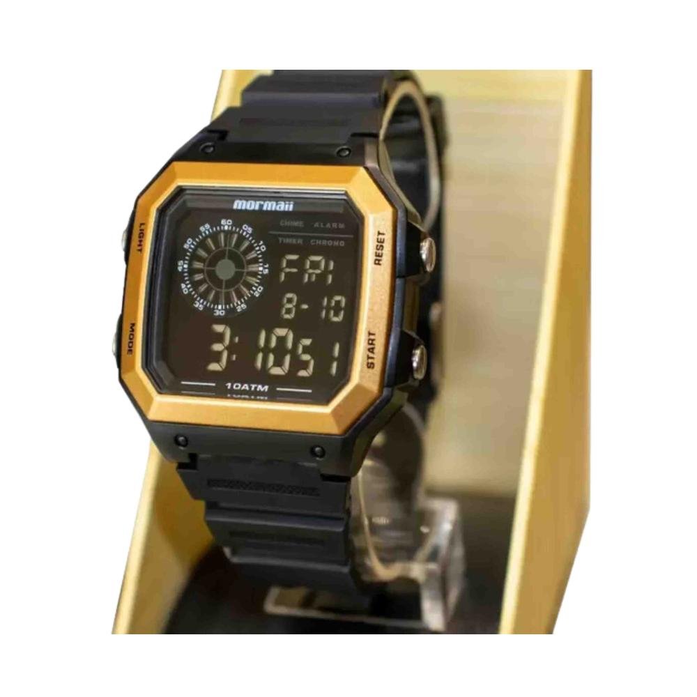 Relógio Mormaii Vibe Dourado MO2002JC/8D Na Elister, a qualidade é uma prioridade em todos os nossos produtos e serviços. Nós nos esforçamos para oferecer aos nossos clientes uma ampla variedade de acessórios, incluindo relógios e óculos de sol, com as melhores marcas e estilos. Além disso, a nossa equipe é treinada para oferecer um atendimento excepcional, garantindo que cada cliente seja tratado com o respeito e a atenção que merece. Nossos relógios são originais e acompanham: Embalagem original; Garantia do fornecedor; Manual de instruções; Nota fiscal simplificada, que vai colada junto à etiqueta. ESPECIFICAÇÕES TÉCNICAS - Marca: Mormaii - Linha: Vibe - Referência: MO2002JC/8D - Gênero: Masculino - Tipo de mostrador: Digital - Função: Calendário, cronômetro, alarme, iluminação de fundo - Tipo de fecho: Fivela - Cor da caixa: Preto - Cor do mostrador: Preto - Cor da pulseira: Preto - Material da caixa: Poliuretano - Material da pulseira: Poliuretano - Largura da caixa: 3,6 cm - Espessura da caixa: 1,3 cm - Comprimento do relógio: 26 cm - Resistência à água: 10 ATM (100m) - Garantia: 12 meses