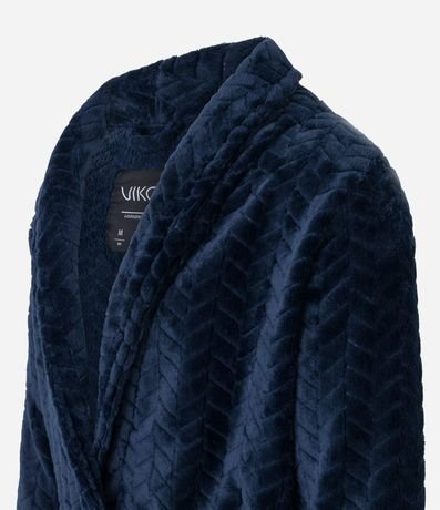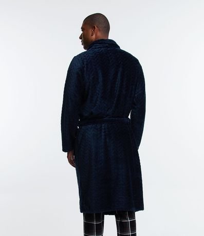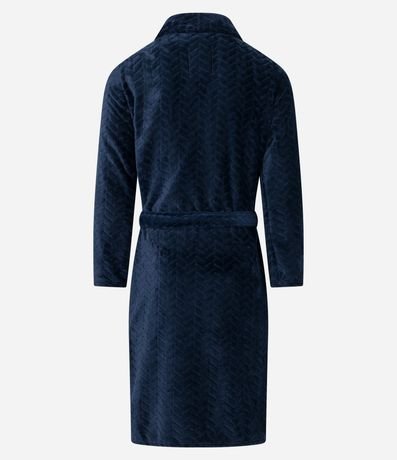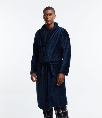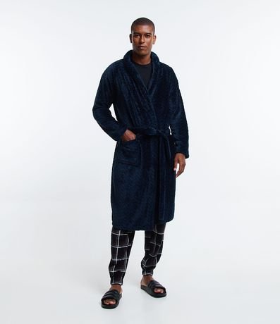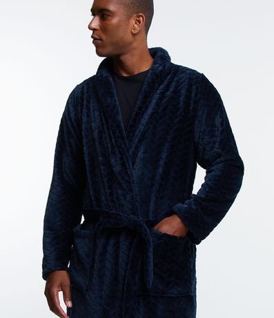 Ref: Roupão masculino, confeccionado em tecido fleece, com gola lapela, mangas longas, amarração na cintura, bolsos frontais e textura.
