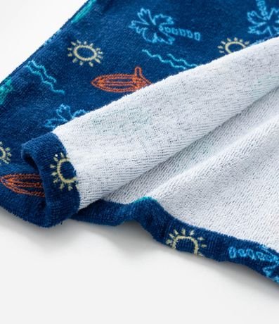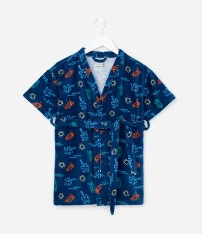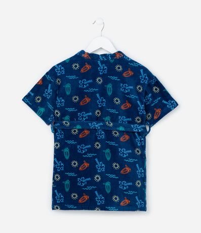Ref: Roupão infantil de modelo atoalhado, confeccionado em algodão de material mais sustentável, ideal para sair do banho ou praia. Possui manga curta, faixa para amarração na cintura e estampa de ícones de praia.