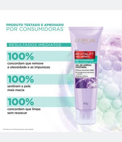 Sabonete Gel de Limpeza Antioleosidade Revitalift Hiaurônico 80g Loreal Paris. O novo Revitalift Hialurônico Gel de Limpeza Anti-oleosidade é um gel de limpeza enriquecido com ácido hialurônico e ácido salicílico que limpa profundamente a pele removendo o excesso de oleosidade e preenche com hidratação, prevenindo o apareciemento de novas linhas de expressão. Reduz a oleosidade (-36%); Combate a acne e desobstrui poros; Hidrata e refresca.