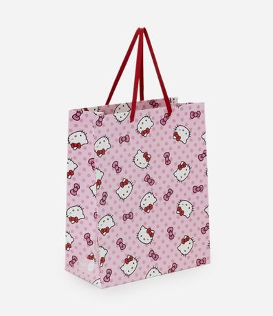 Embalagem para presentes confeccionado em papel e papelão Fsc. Possui modelo de sacola, tamanho médio, alça chata de mão e estampa divertida da hello kitty.