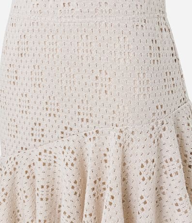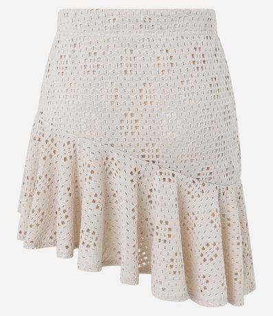 Ref: Saia ajustada curta com pontos abertos, barra assimétrica com babados.