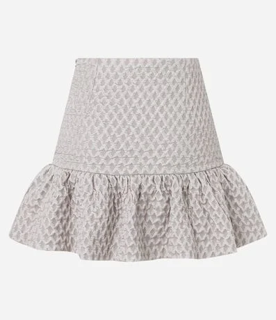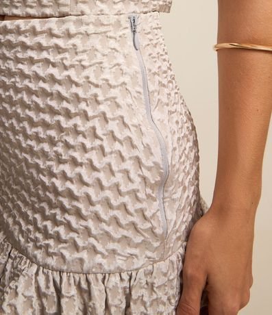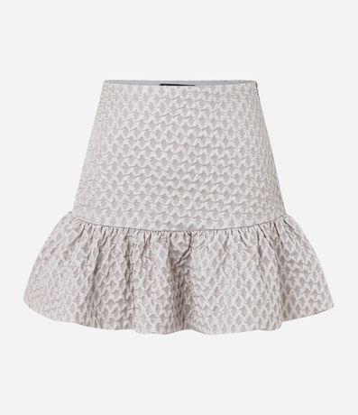 Ref: Saia balonê curta com fechamento lateral por zíper, barra franzida e textura jacquard.