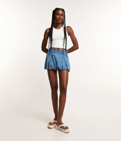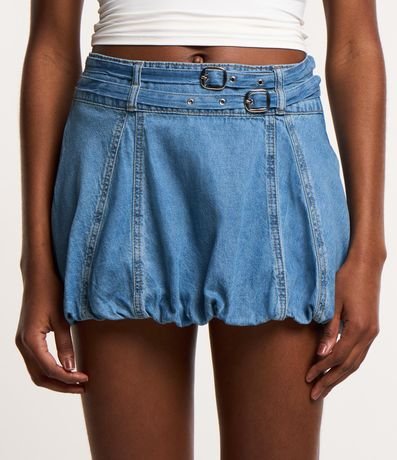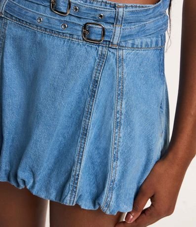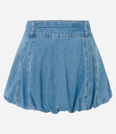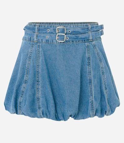 Ref: Saia curta de modelo balonê, confeccionada em jeans de lavagem destroyer, com 02 cintos finos e costuras frontais.