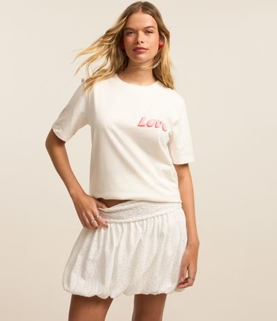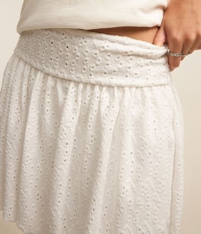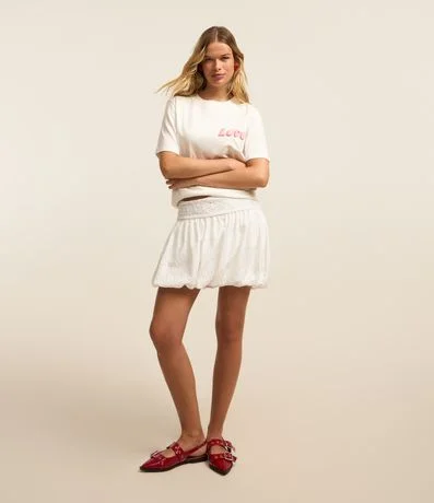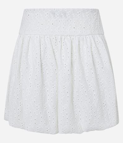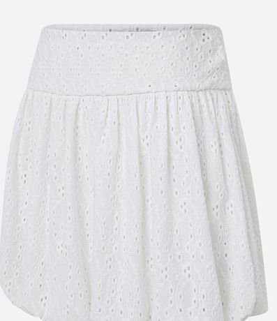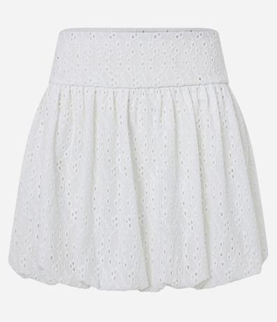Saia curta, balonê com cós elástico e largo, confeccionada em laise e com textura floral.