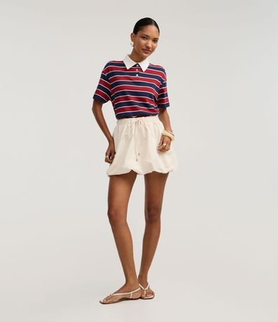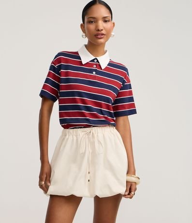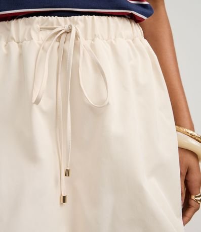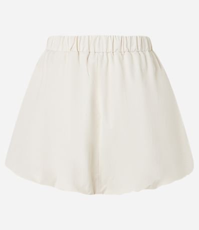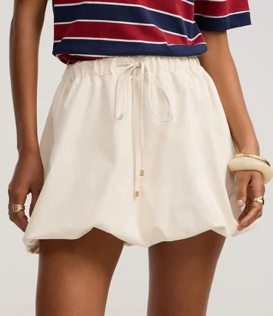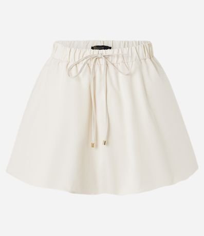 Ref: Saia balonê curta, confeccionada em tricoline, com elástico e amarração com ponteiras metalizadas no cós. Minissaia com efeito franzido logo abaixo do cós.