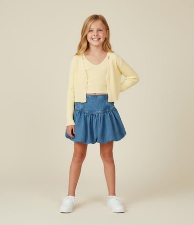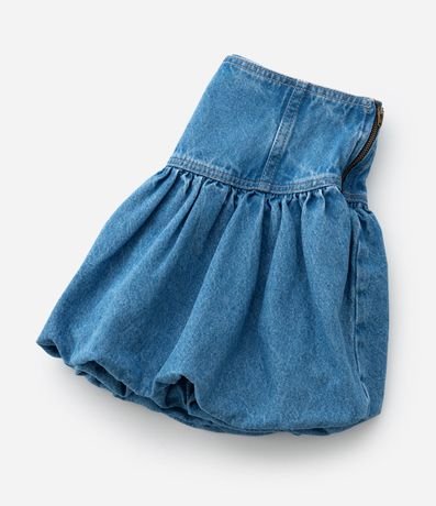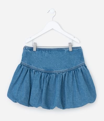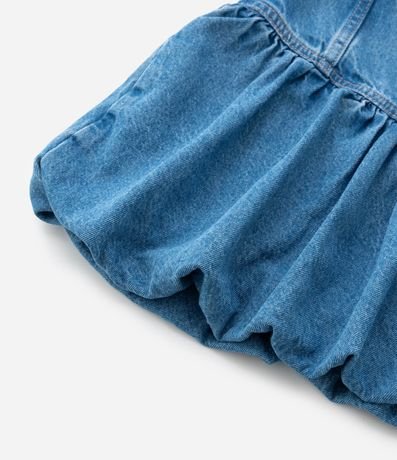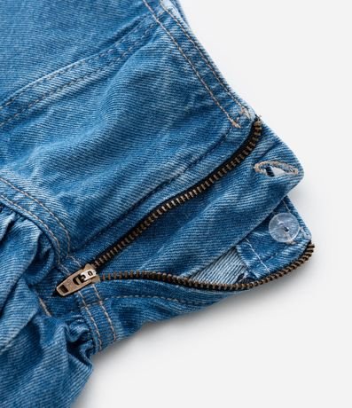 Ref: Saia infantil confeccionada em jeans mais sustentável através de boas práticas ambientais, no modelo balonê. Possui cós largo, preguinhas e fechamento lateral por zíper e botão.