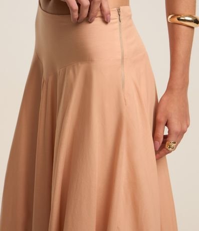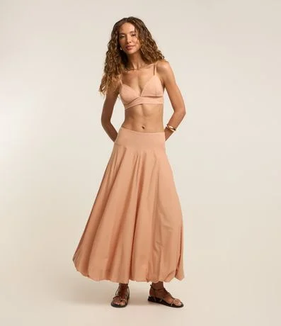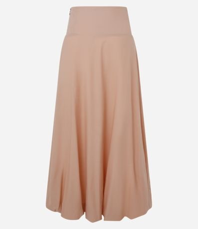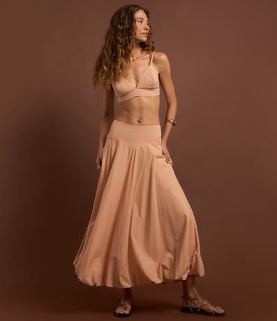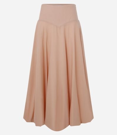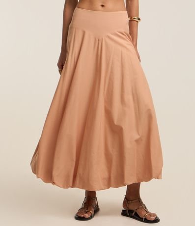 Saia balonê, midi com cós elástico largo, confeccionada em tricoline e com pregas.