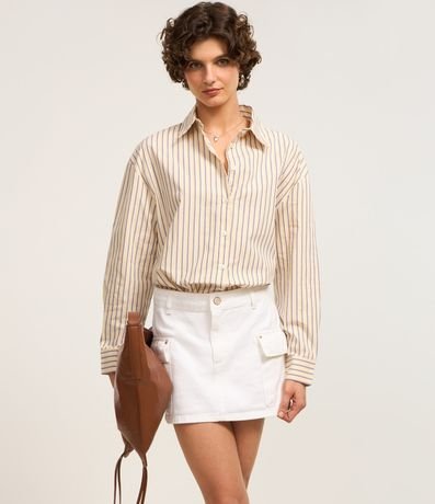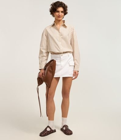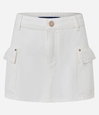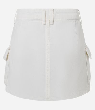 Ref: Saia cargo curta feminina, confeccionada em sarja, com abotoamento frontal no cós, passantes, bolsos laterais e superfície sem estampa.