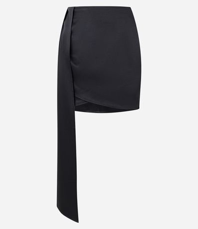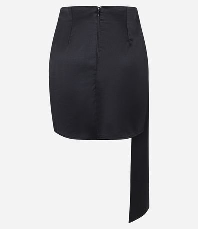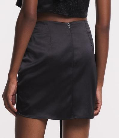 Saia curta, textura acetinada, zíper invisível nas costas e faixa caída na lateral.