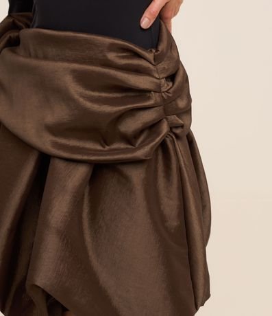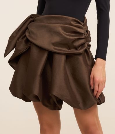 Saia curta, balonê com drapeado lateral, com textura brilhosa, produzida em boas práticas ambientais, detalhe lateral e sem estampa.