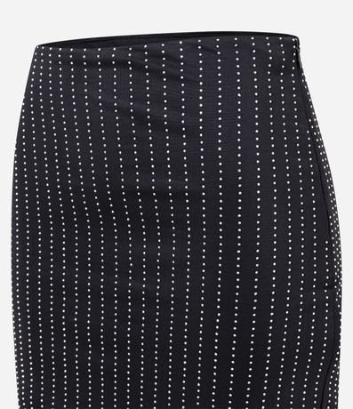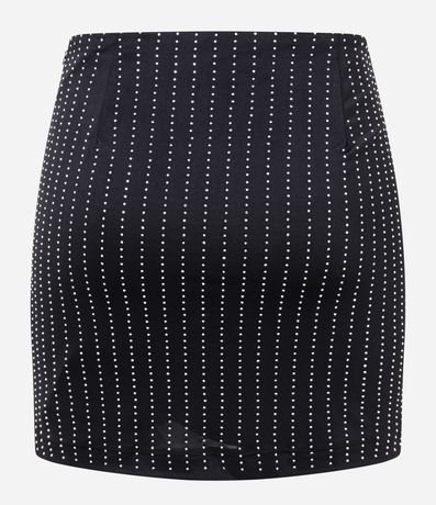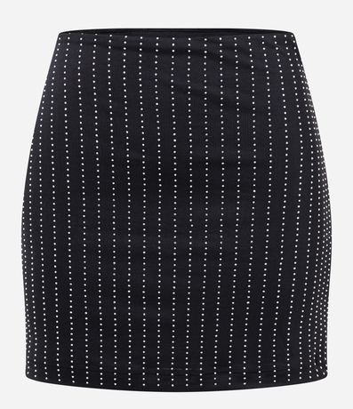 Saia curta com fechamento por zíper invisível na lateral e listras de brilhos aplicados.